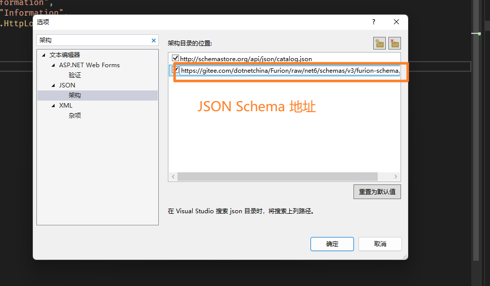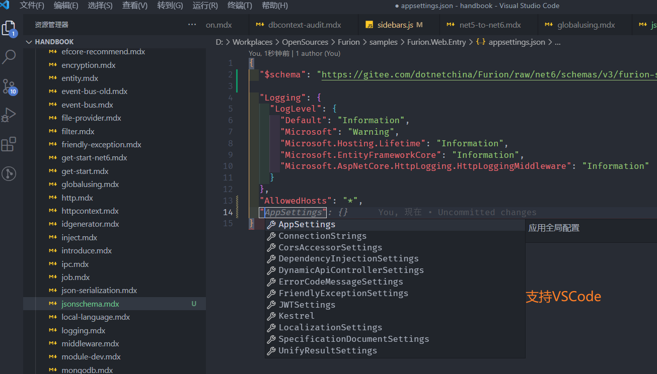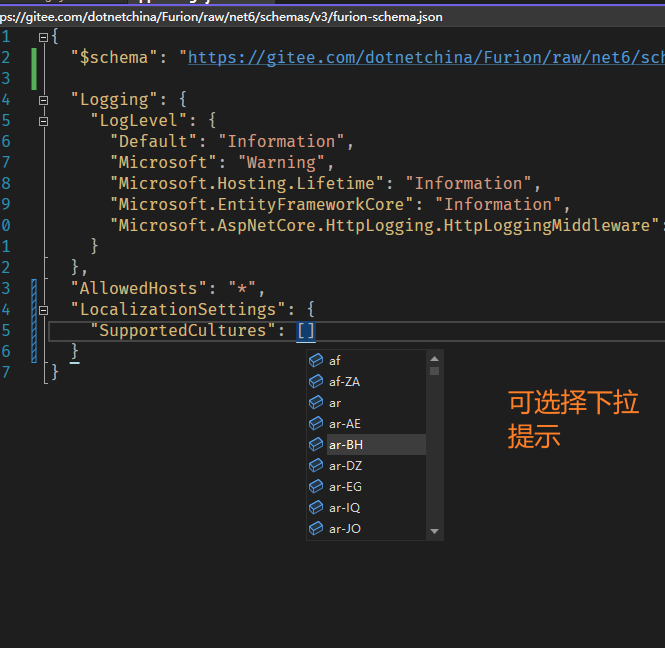 Furion 框架提供了完整的 FurionASP.NET CoreJSON Schema 文件,通过该文件可以在编写配置文件时提供完整的智能提示和校验。