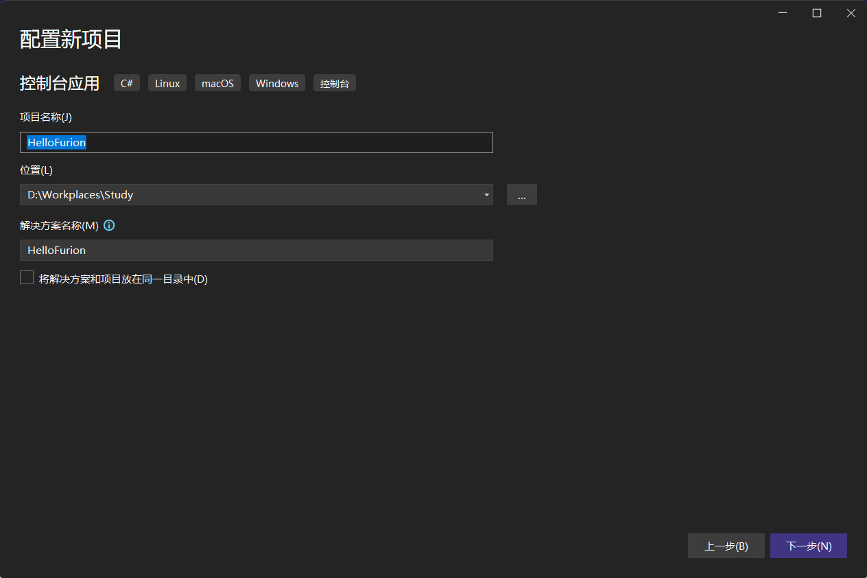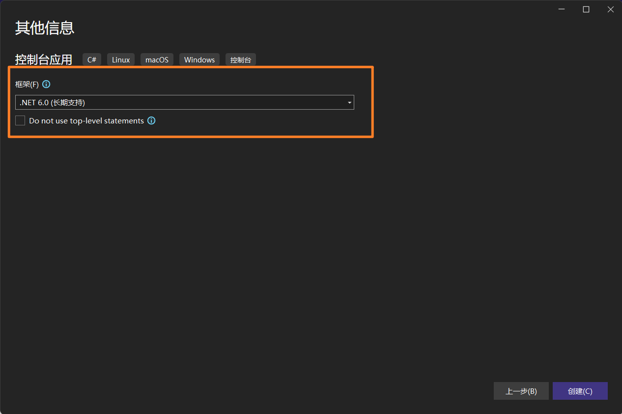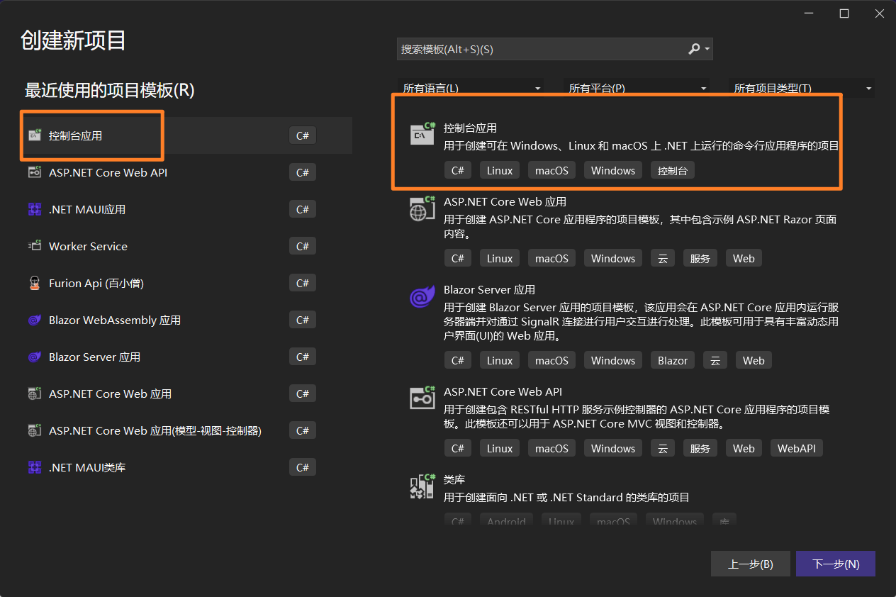 • 打开 Visual Studio 2022 并创建 控制台 项目