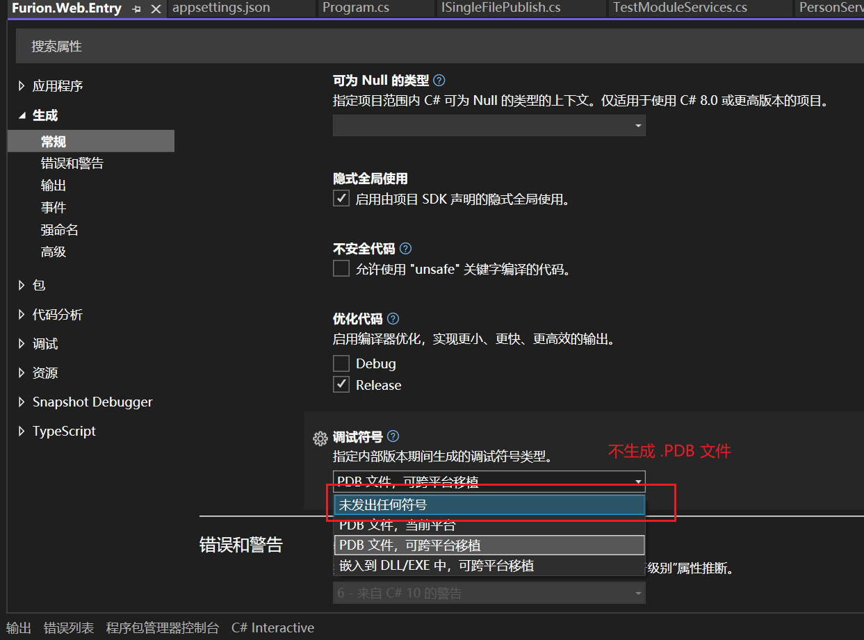 如无需生成 .pdb 调试包可在生成中禁用即可。